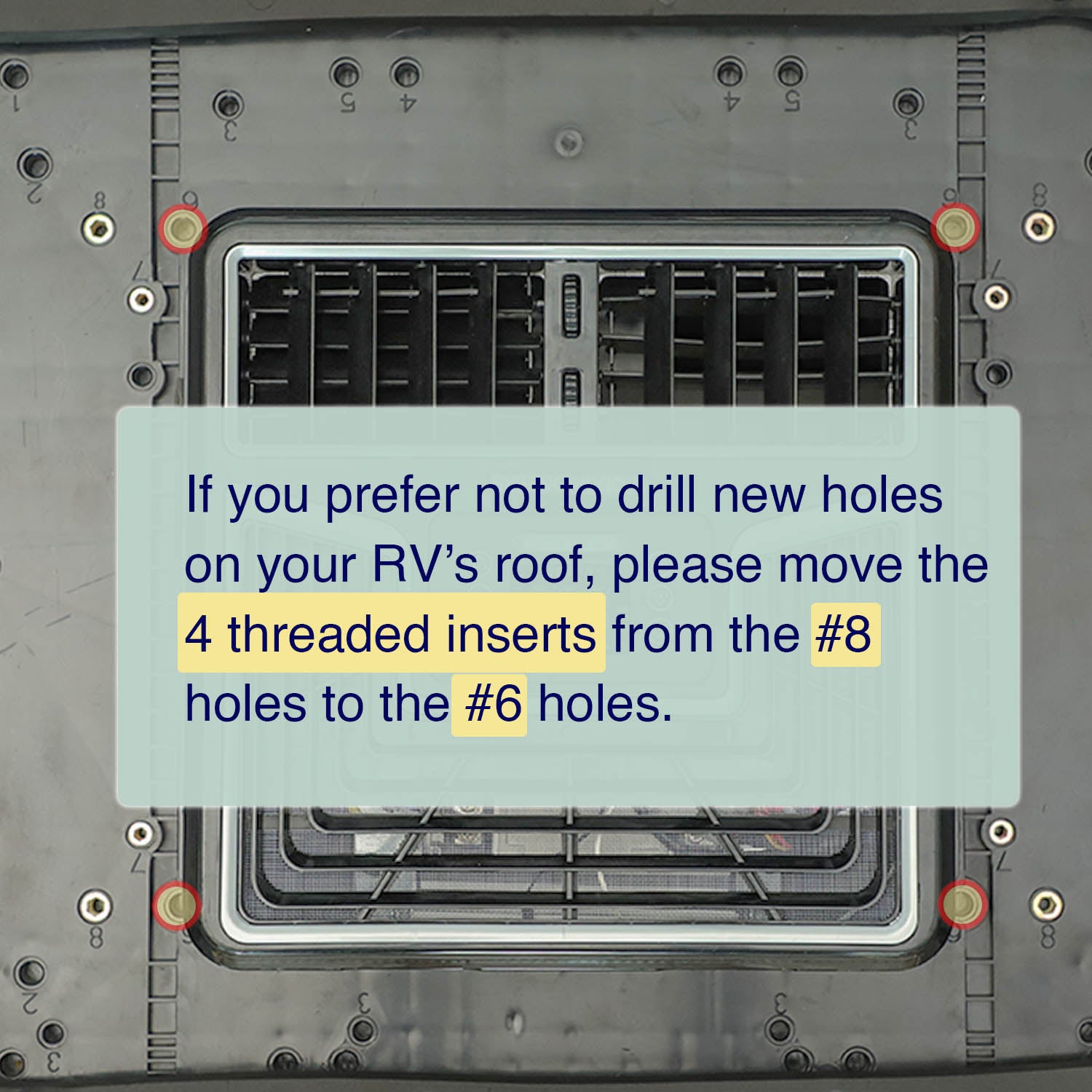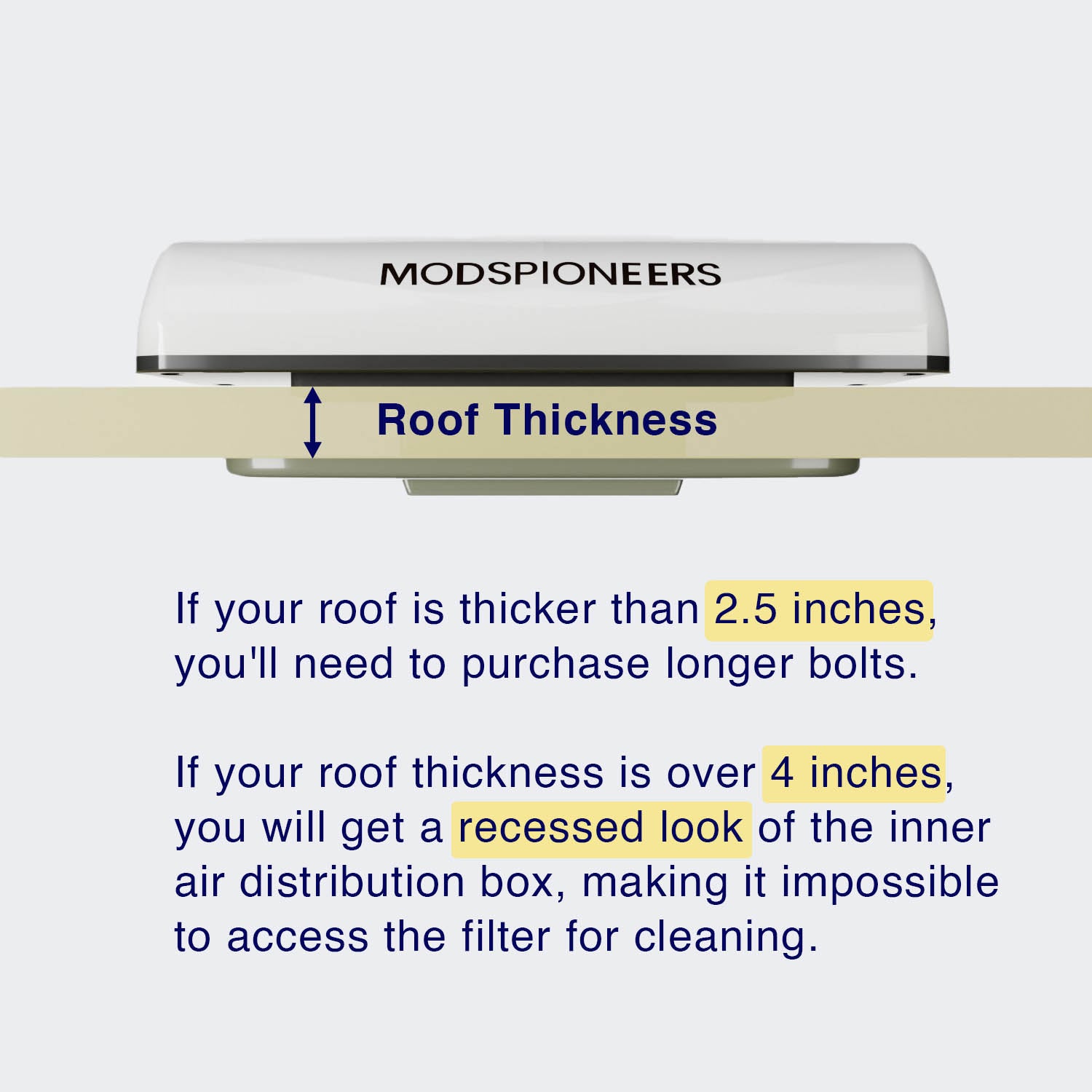 The included mounting bolts are designed for a roof thickness of 2.5" or less. If your roof is thicker than 2.5", you'll need to purchase longer bolts. If your roof thickness is over 4", you will get a recessed look of the inner air distribution box, making it impossible to access the filter for cleaning.