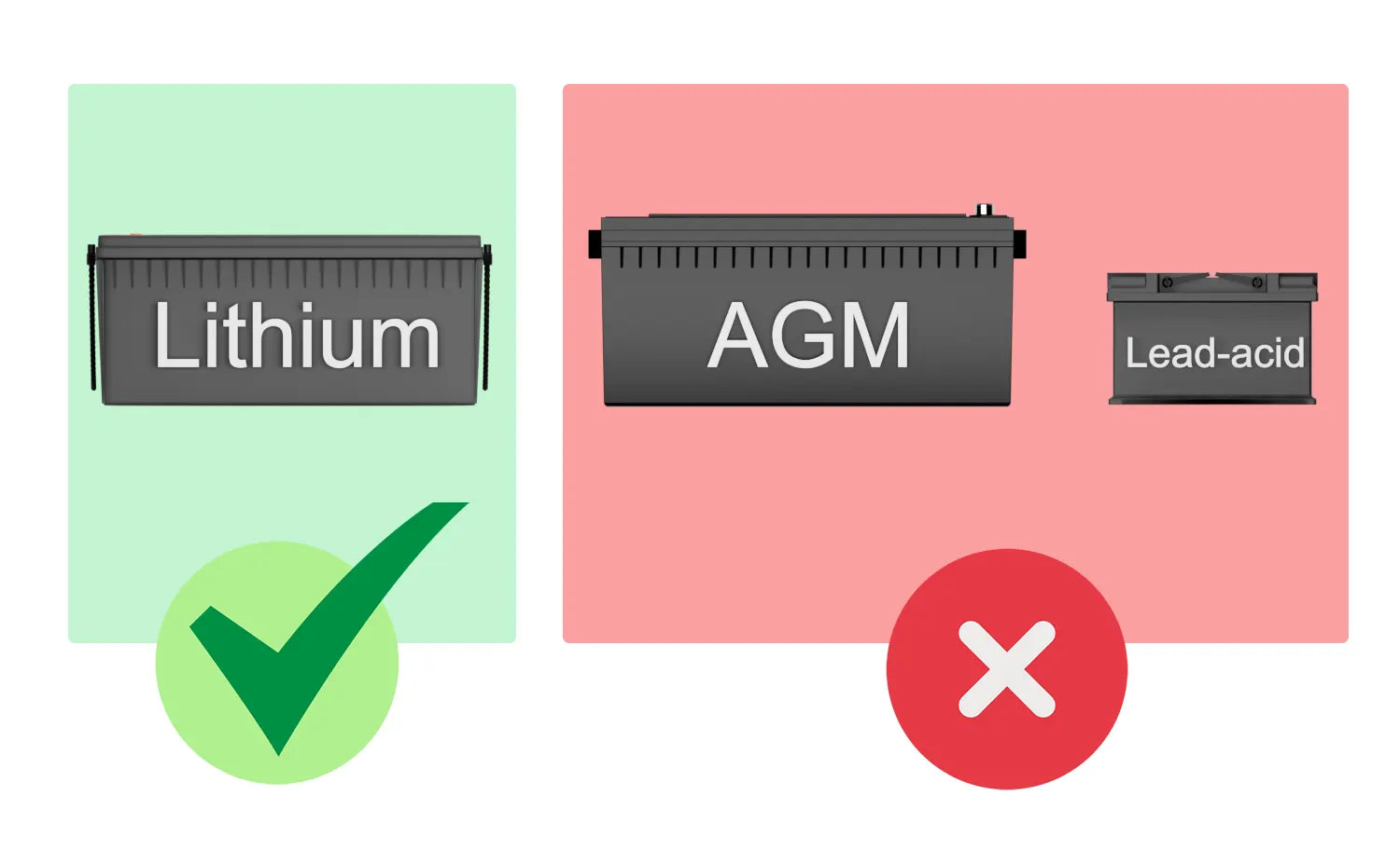 Recommended: Lithium battery for maximum usable power. Lithium safely delivers nearly full capacity (down to 20%). AGM/Lead-Acid must be kept above 50% to avoid damage.