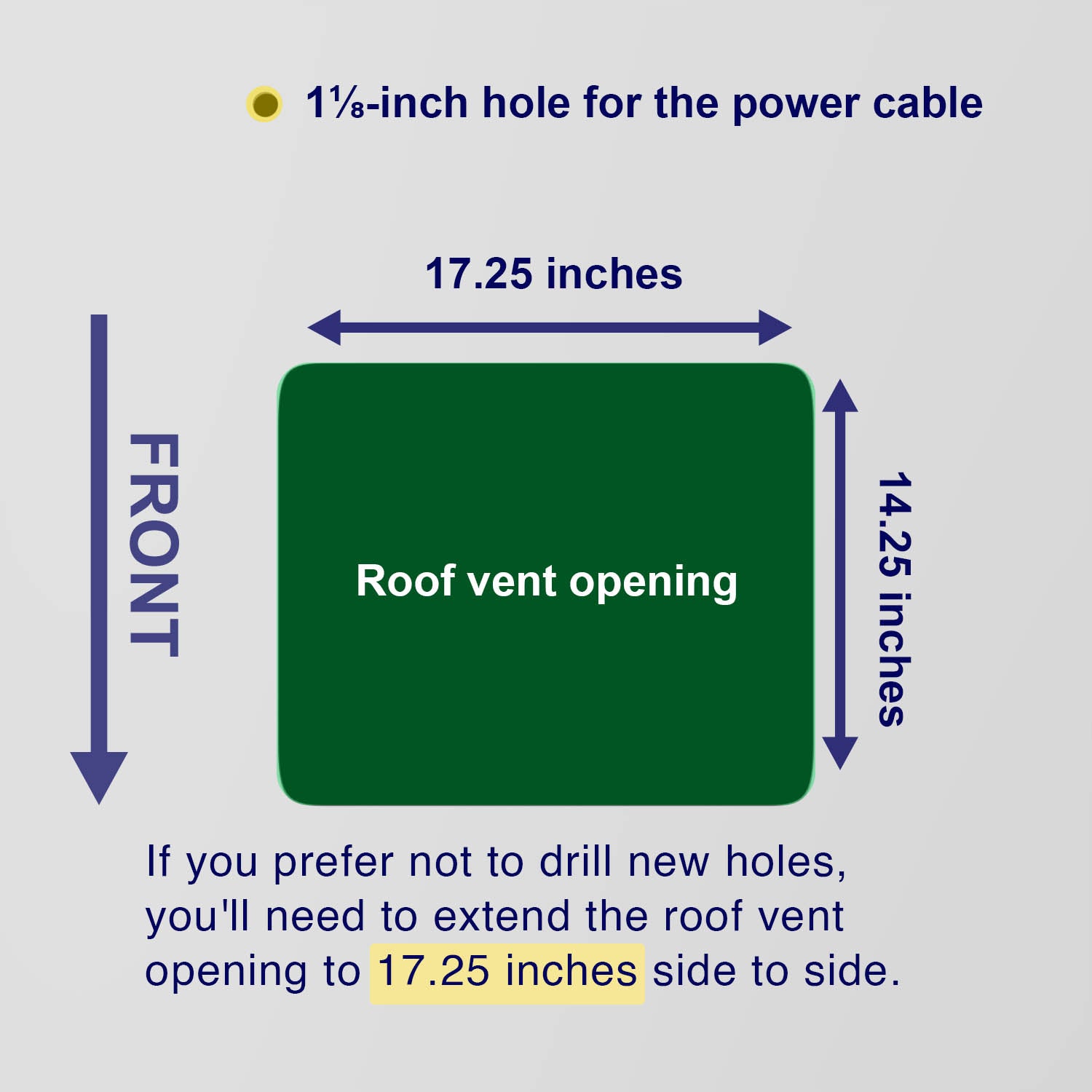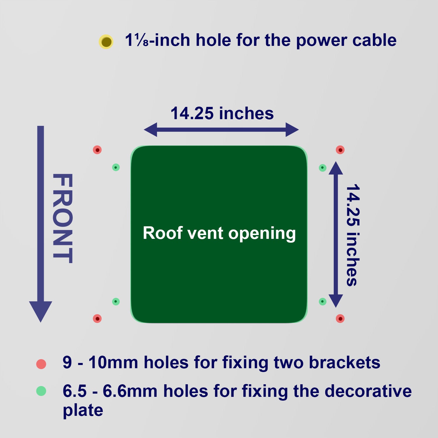 The air distribution box fits a standard 14.25" x 14.25" roof vent. -